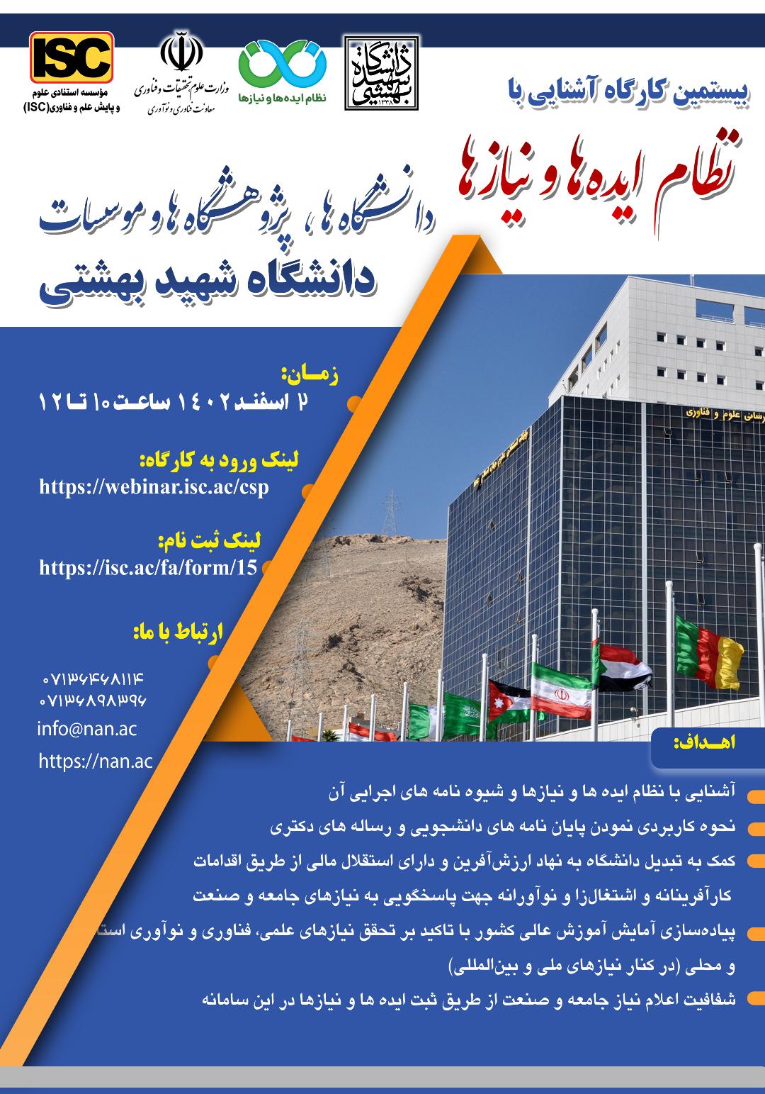 با توجه به درخواست اکثر دانشکده‌­ها و پژوهشکده‌­ها در خصوص برگزاری کارگاه آموزشی سامانه نان، طی هماهنگی‌­های انجام شده با دبیرخانه نظام ایده‌­ها و نیازها، کارگاه آموزشی آنلاین "آشنایی با نظام ایده‌­ها و نیازها و شیوه­‌نامه‌­­های اجرایی آن" در روز چهارشنبه مورخ 1402/12/02 ساعت 10 الی 12 برگزار خواهد شد.